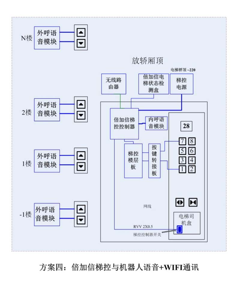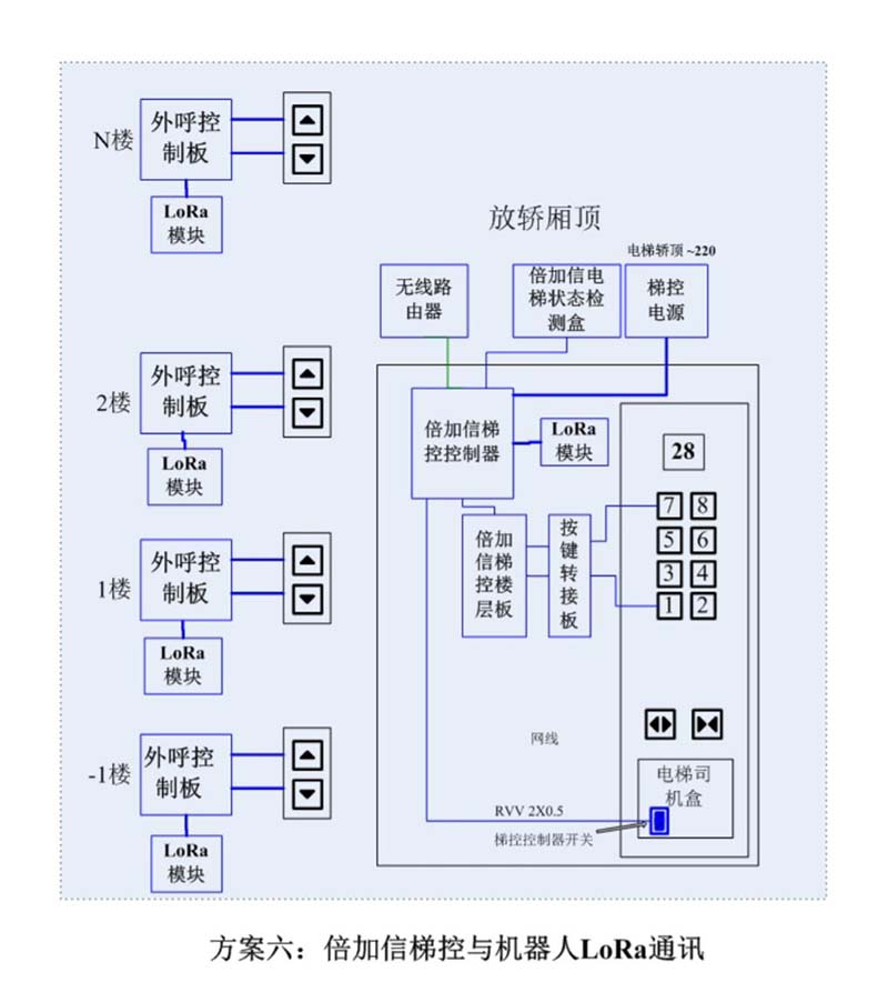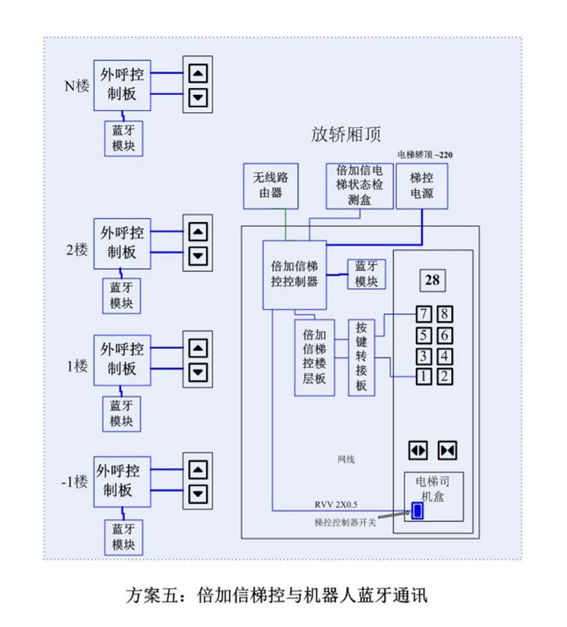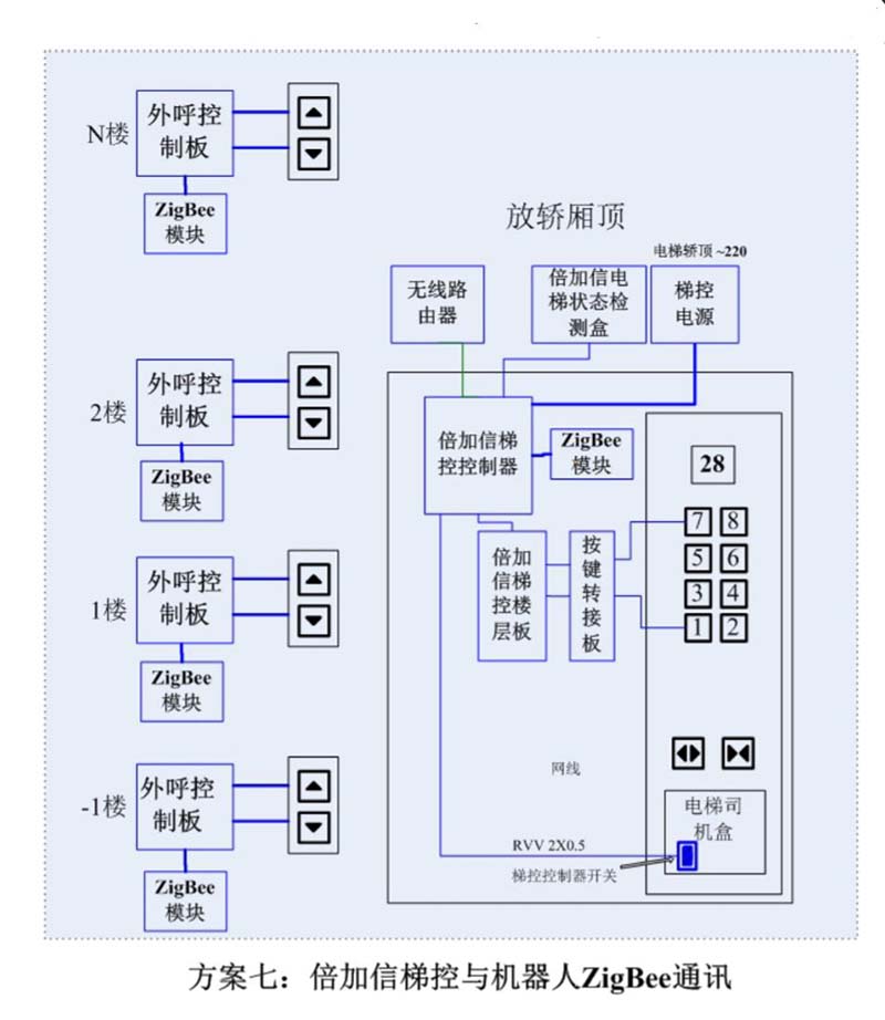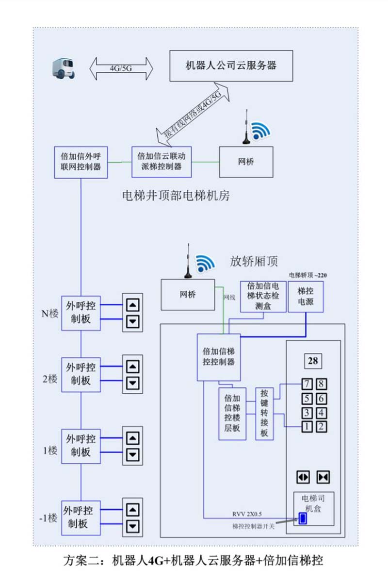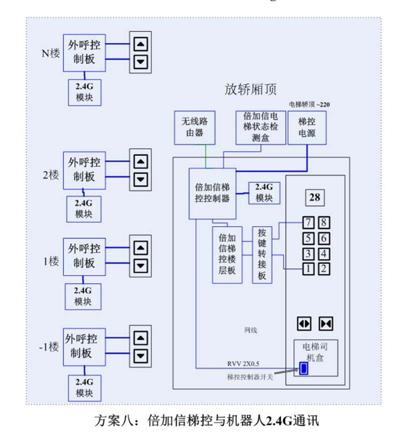 (1)機(jī)器人在電梯外,通個(gè)Wifi、藍(lán)牙、LoRa、Zigbee、2.4G、433M、語(yǔ)音或4G網(wǎng)絡(luò)等發(fā)送指令倍加信梯控系統(tǒng),系統(tǒng)自動(dòng)點(diǎn)亮上樓或下樓按鍵,實(shí)現(xiàn)呼梯功能。